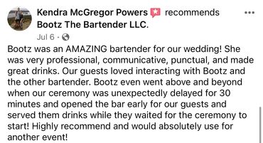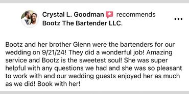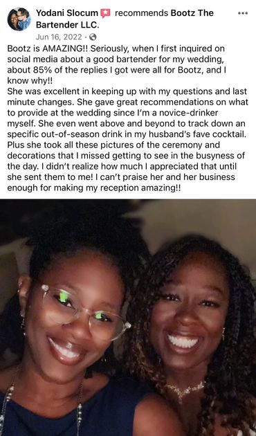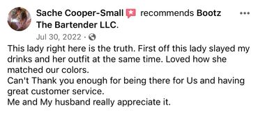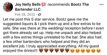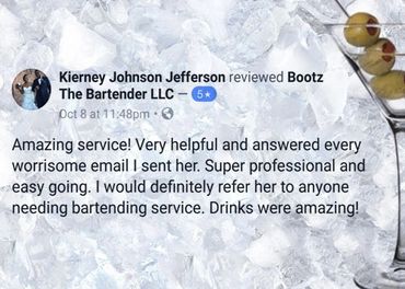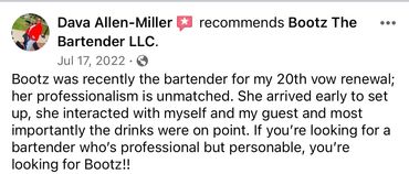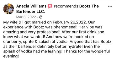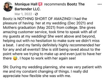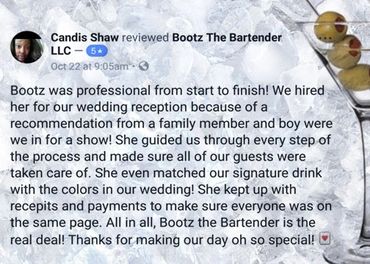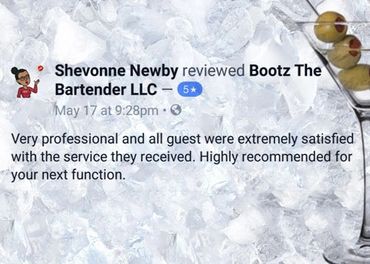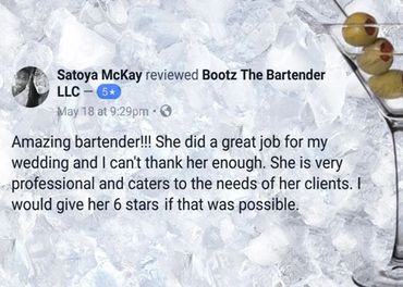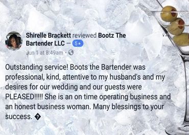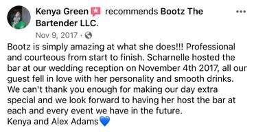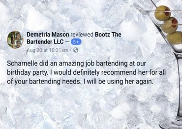 Thank you for taking the time to visit my page. My name is Scharnelle "Bootz" Hamlin, CEO of Bootz the Bartender LLC. If you take a look around, you will see that I absolutely LOVE bartending. Since 2017, I have bartended over 400+ events from million dollar mansions to the patios of your backyard barbeques. Bartending has afforded me opportunities that most dream of. I have met some amazing people along the way and formed lasting partnerships for years to come. I graduated from the Professional Bartending Academy in Richmond, Virginia on May 3, 2016, and I have been mixing it up ever since. I am a Certified Mixologist specializing in signature cocktails for any occasion. Whether it is a wedding reception, birthday party, or a private intimate function, I will ensure that all your bartending needs are met. I consider myself to be exceptionally meticulous and energetic with a superior customer service record. "For me bartending is much more than pouring a drink; it’s about creating an experience that your guests will never forget!" With my ambition, goals, and determination, I inspire to be one of the most sought out bartenders for many events to come.